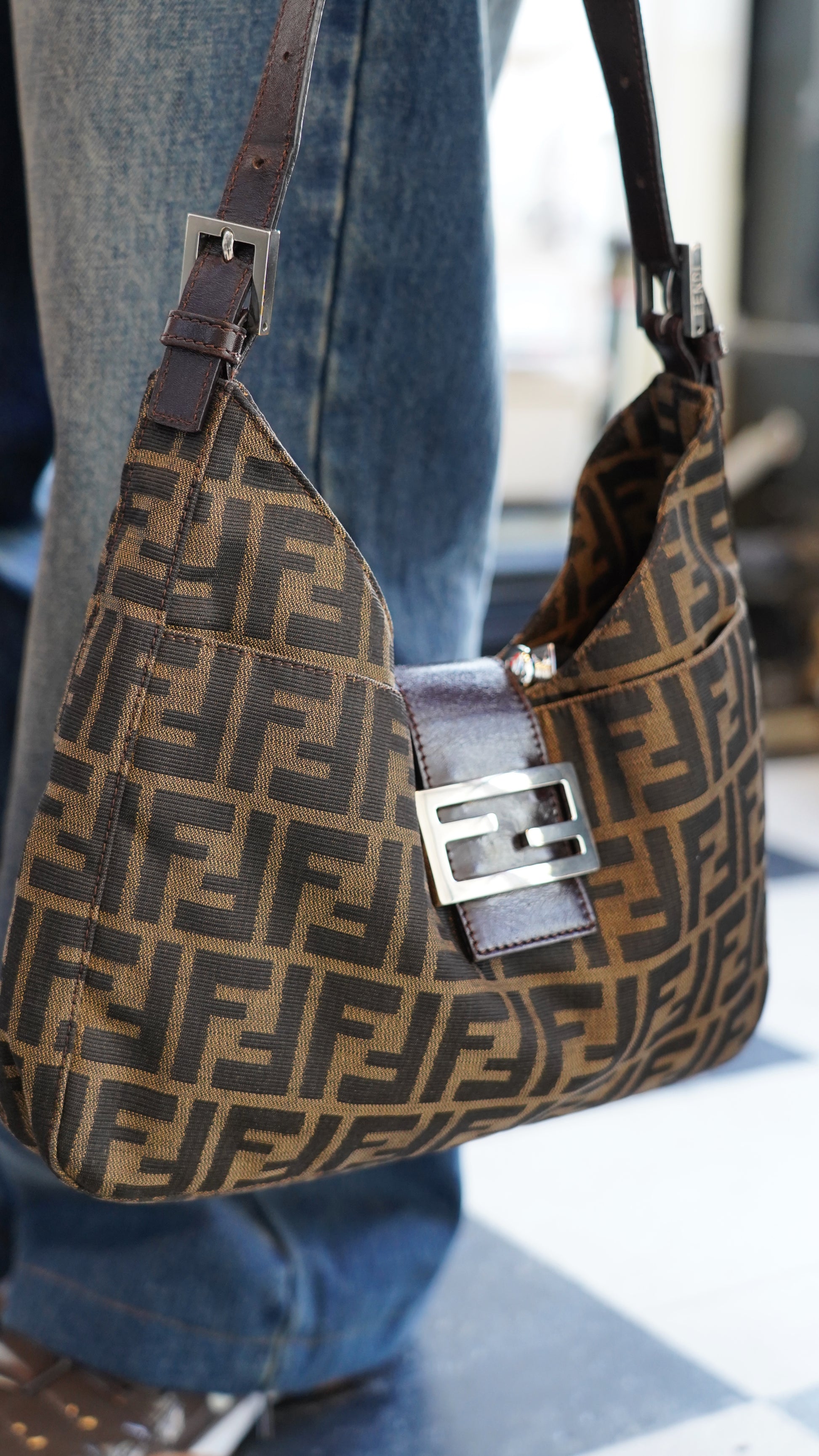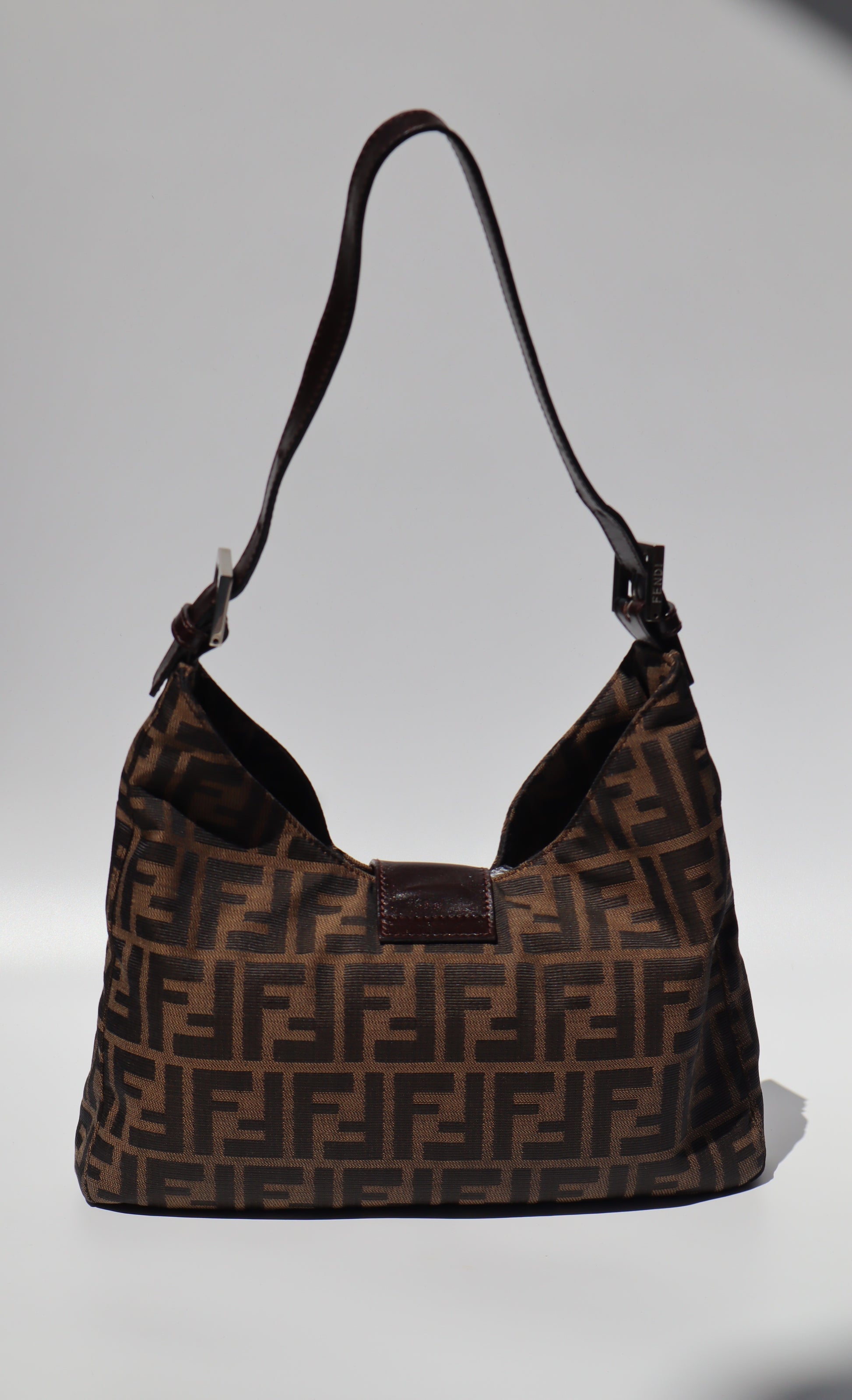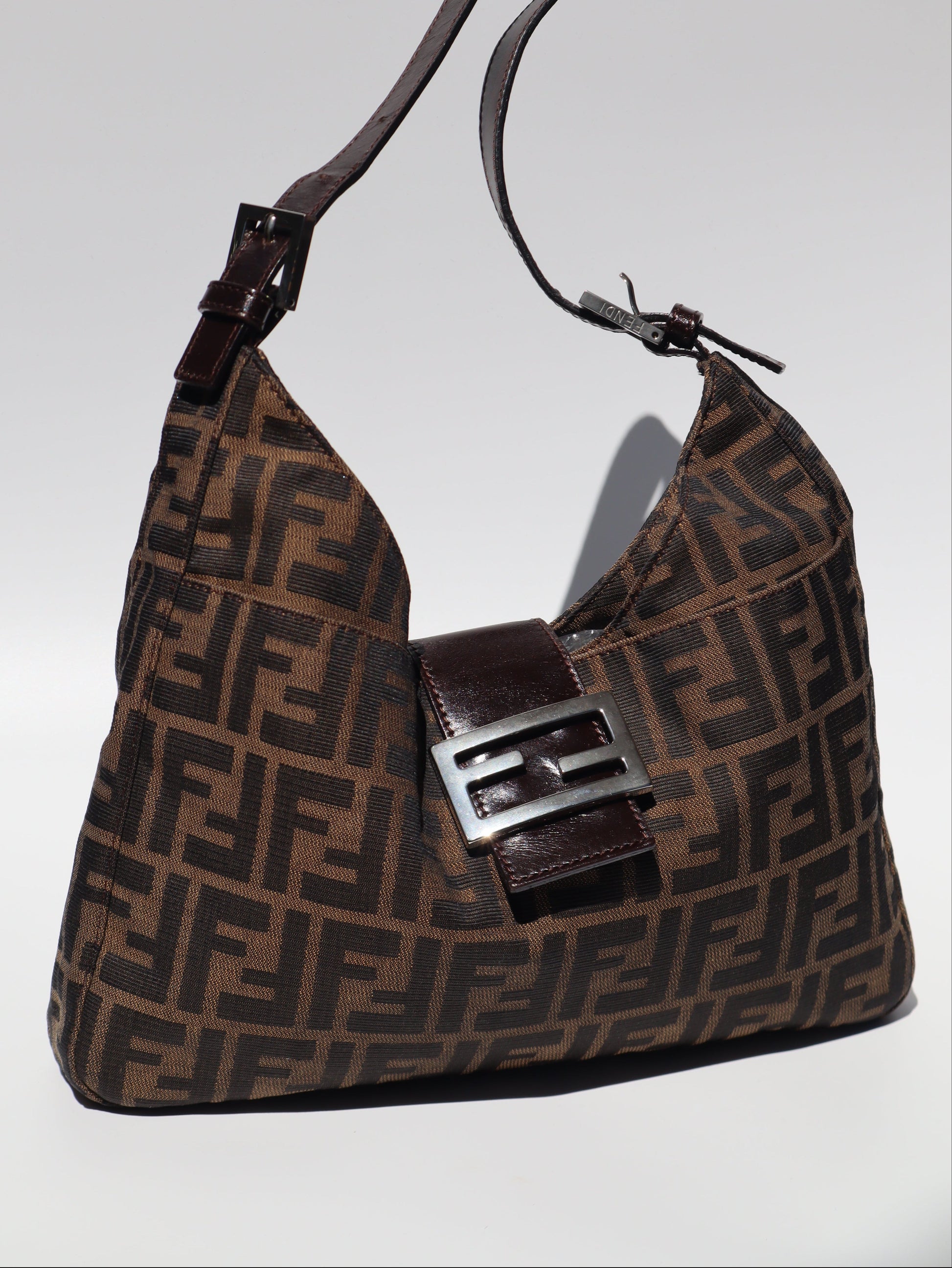 A signature Y2K silhouette crafted in Fendi's instantly recognisable Zucca canvas, this shoulder bag features the FF monogram throughout, finished with a leather strap and logo buckle detail at the front. Designed for easy, everyday wear with timeless appeal. A true Fendi classic waiting to be Loved, Again.
