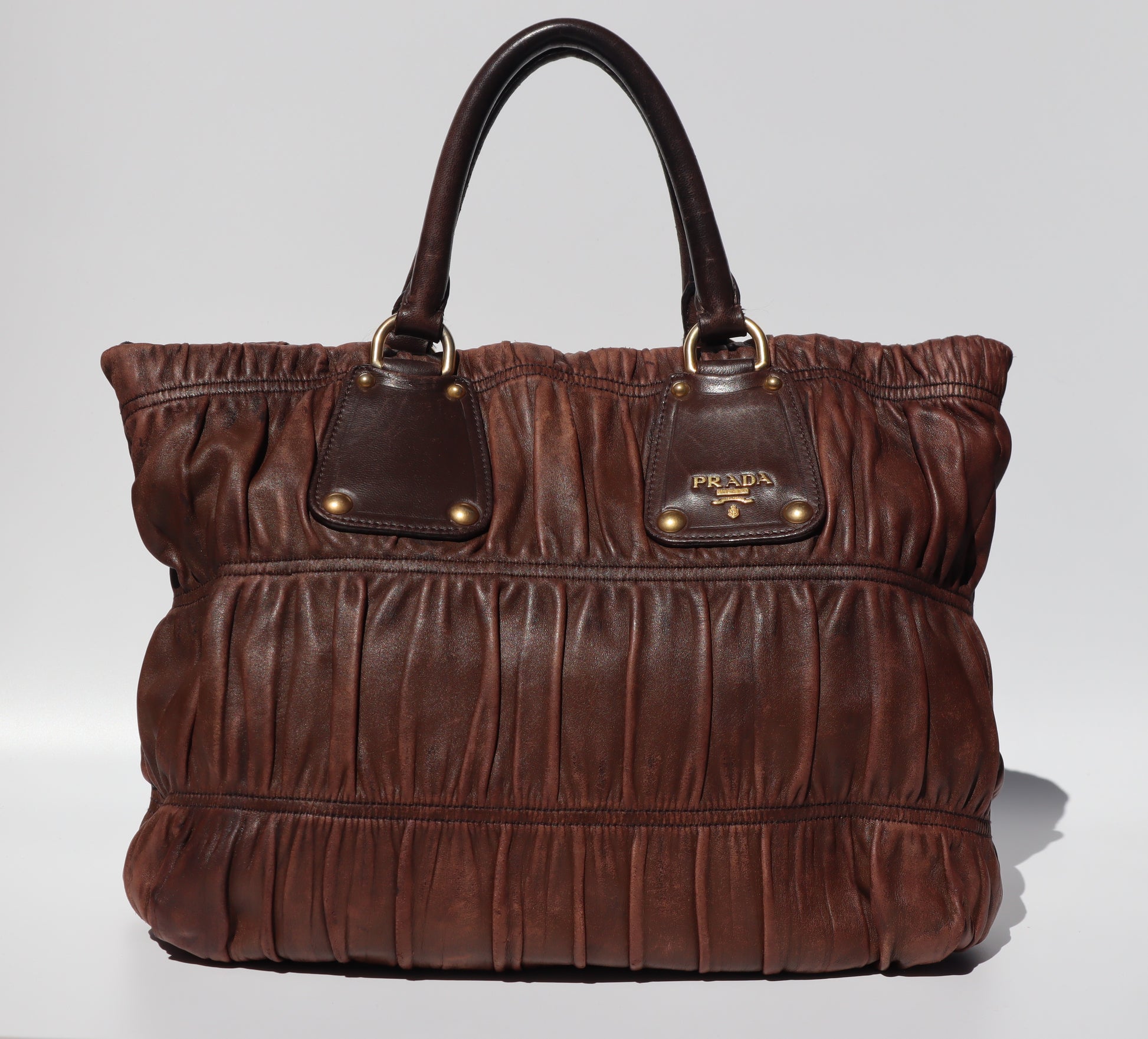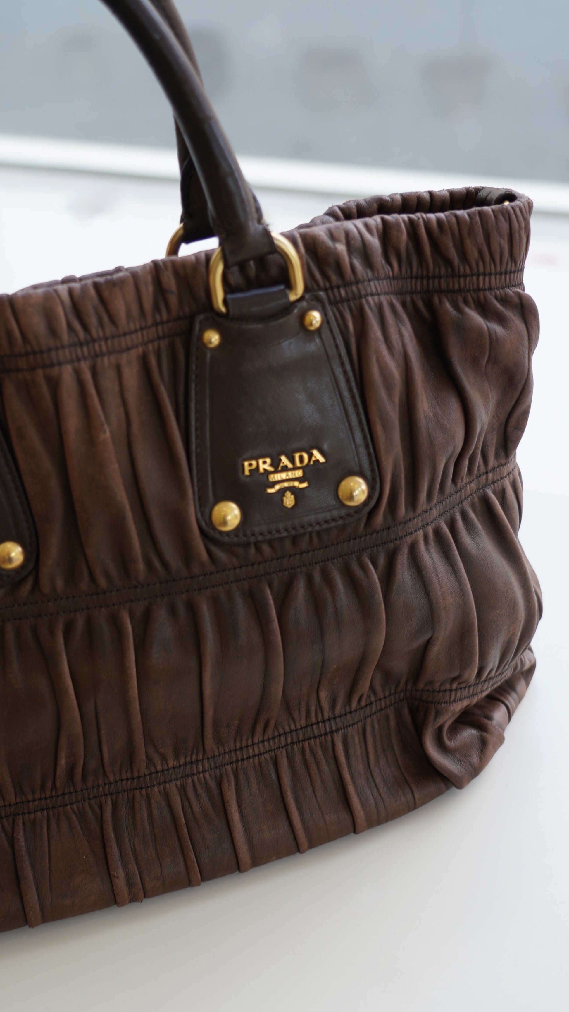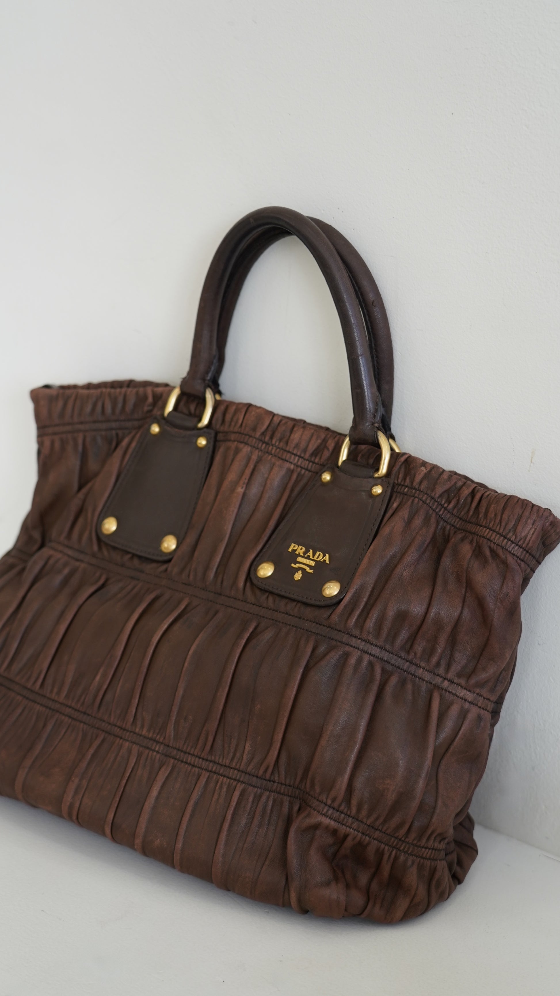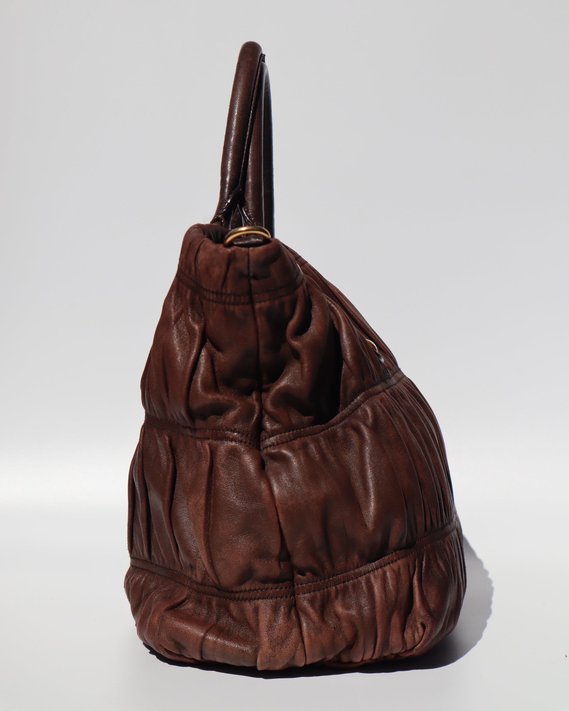 A soft, sculpted classic from Prada, crafted in buttery Nappa with their signature gaufre ruching. Finished in rich chocolate brown with gold tone hardware for that understated 2000s Prada look we all love.