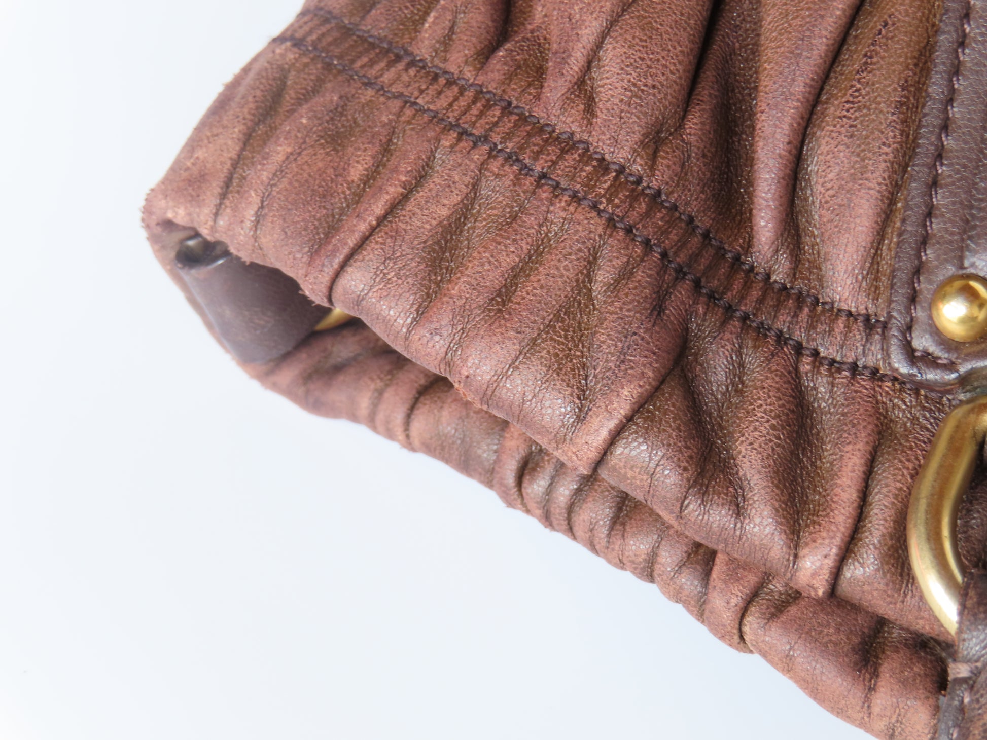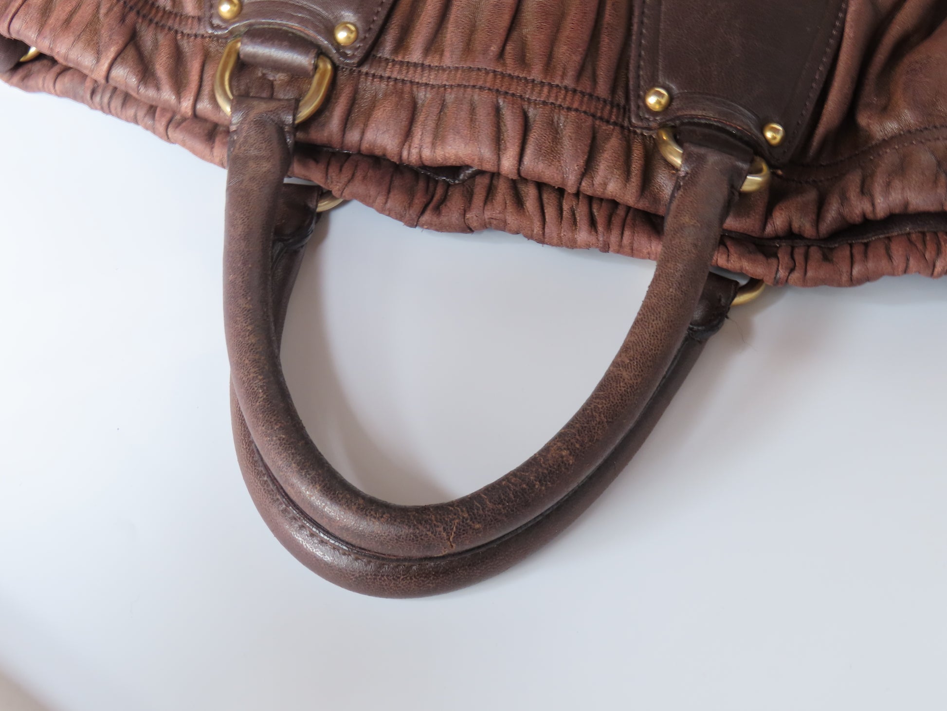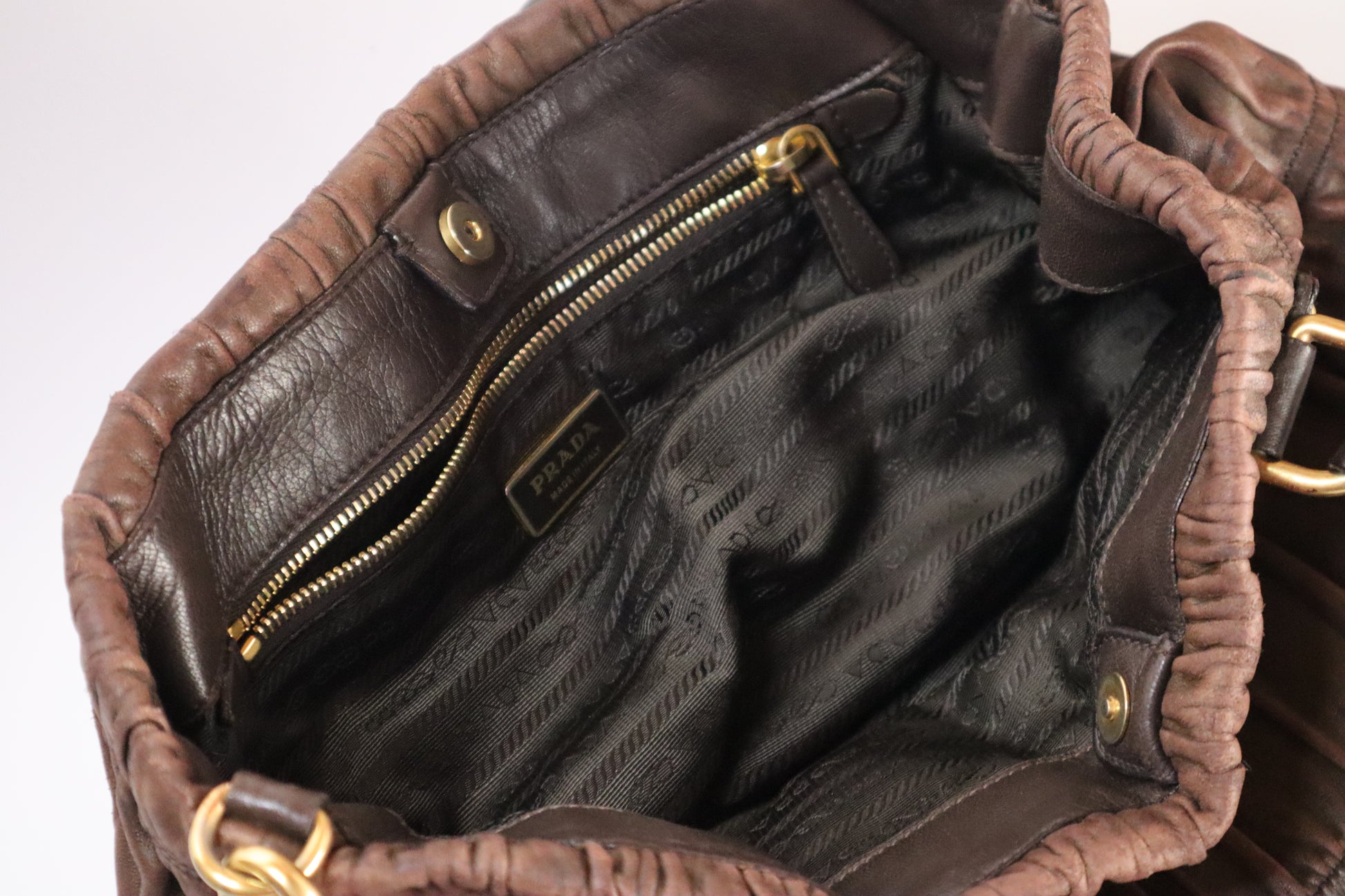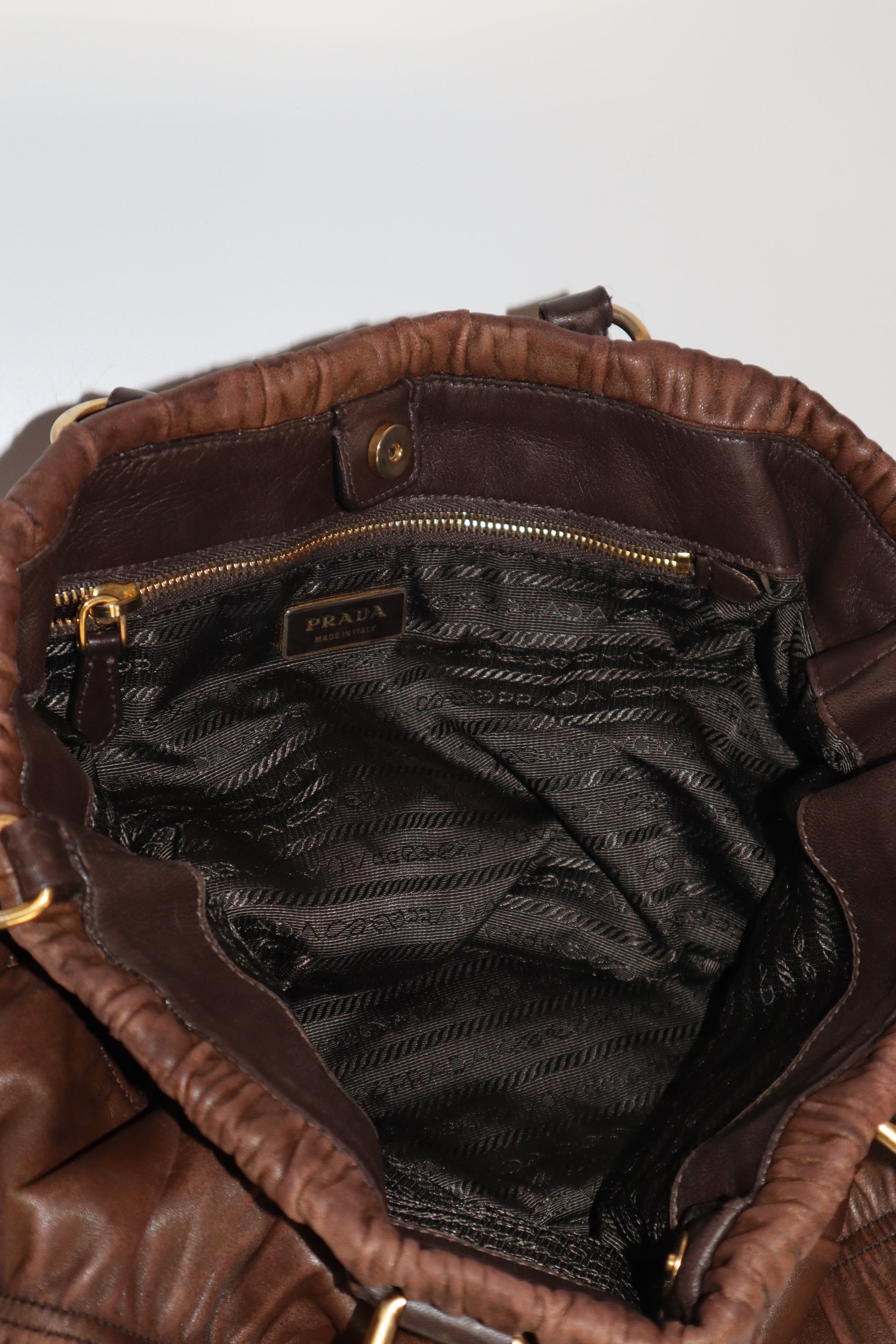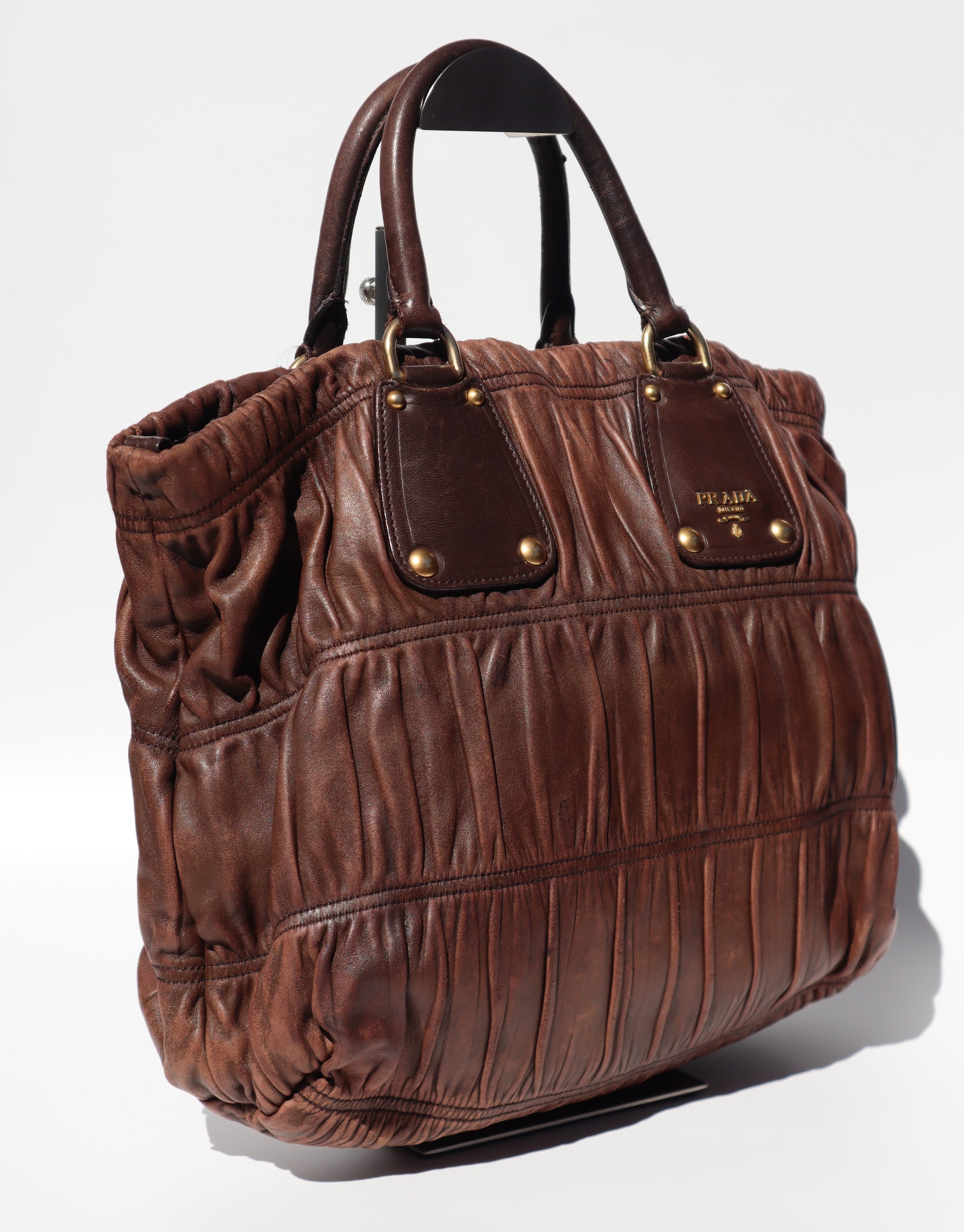 A soft, sculpted classic from Prada, crafted in buttery Nappa with their signature gaufre ruching. Finished in rich chocolate brown with gold tone hardware for that understated 2000s Prada look we all love.